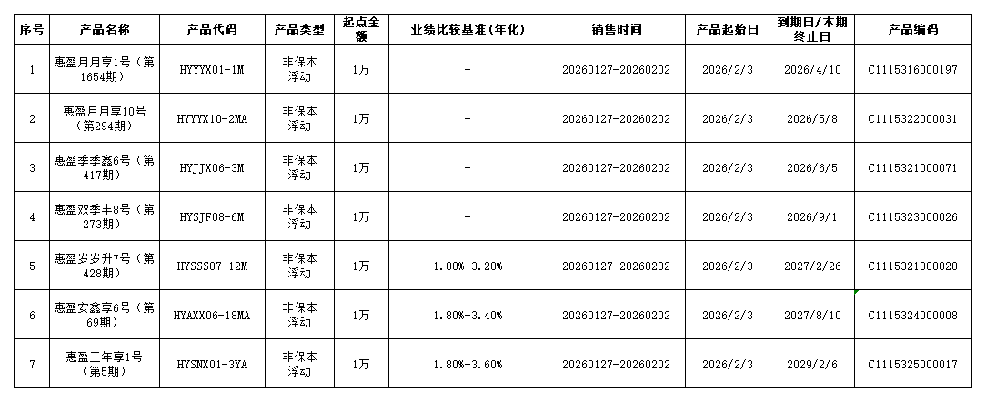“金石榴惠盈系列”7款人民币理财产品将于2026年1月27日至2026年2月2日在我行各网点、网上银行、自助终端、手机银行发售,产品概况如下:
