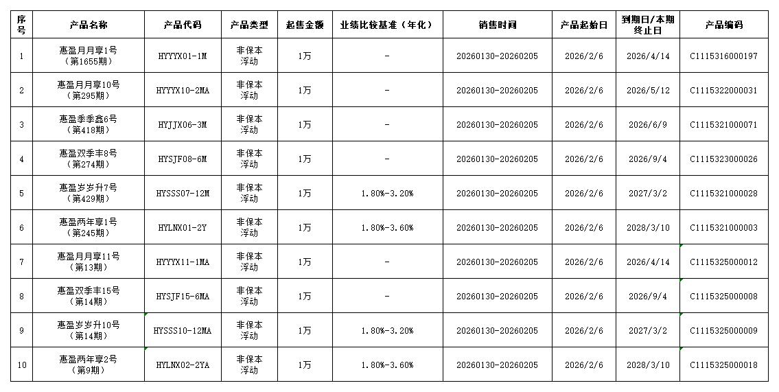“金石榴惠盈系列”10款人民币理财产品将于2026年1月30日至2026年2月5日在我行各网点、网上银行、自助终端、手机银行发售,产品概况如下: