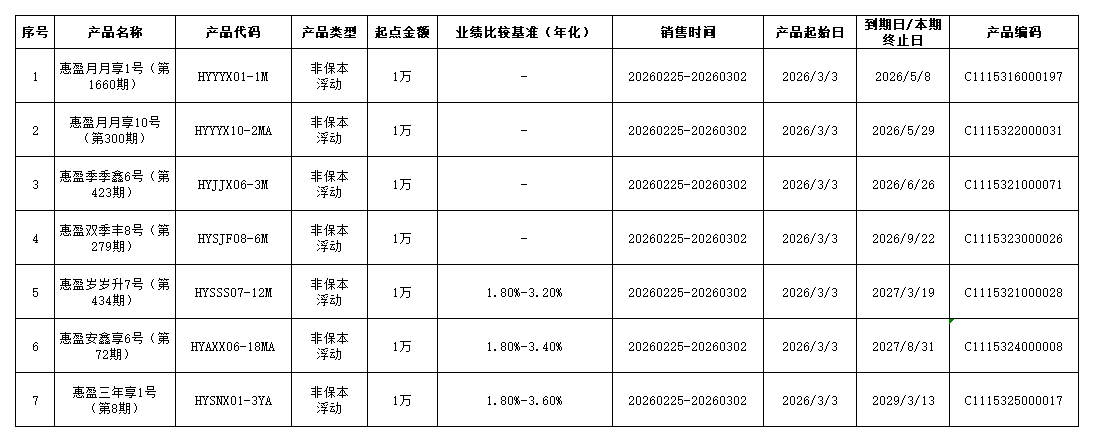 “金石榴惠盈系列”7款人民币理财产品将于2026年2月25日至2026年3月2日在我行各网点、网上银行、自助终端、手机银行发售,产品概况如下: