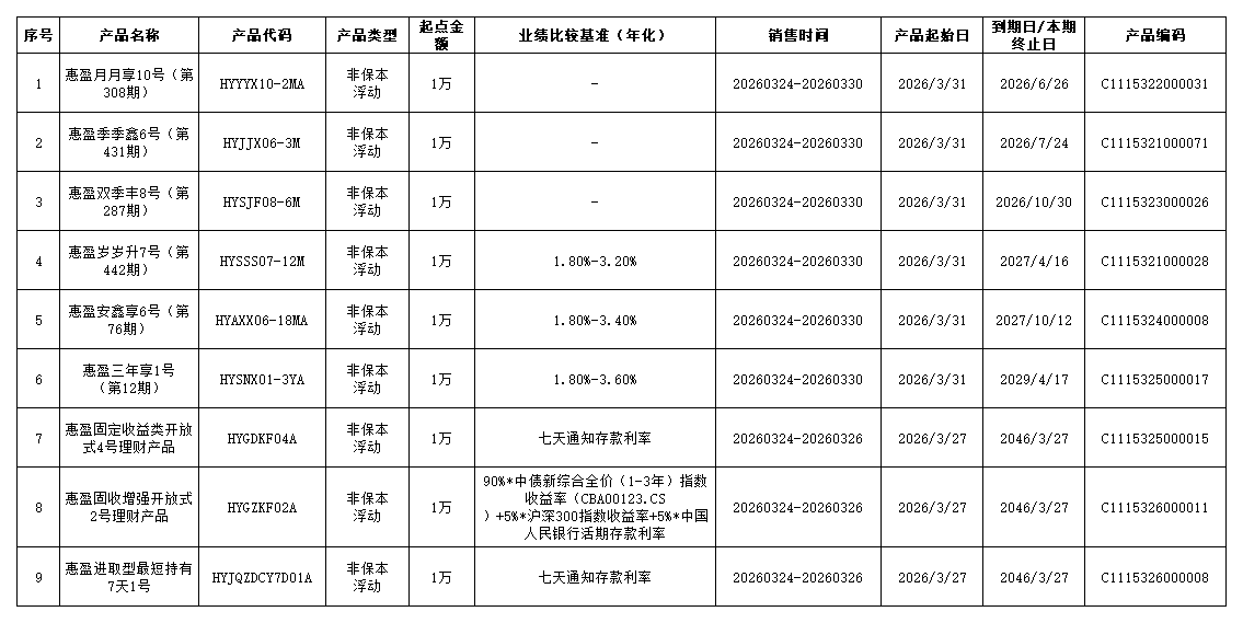 “金石榴惠盈系列”9款人民币理财产品将于2026年3月24日至2026年3月30日在我行各网点、网上银行、自助终端、手机银行发售,产品概况如下: