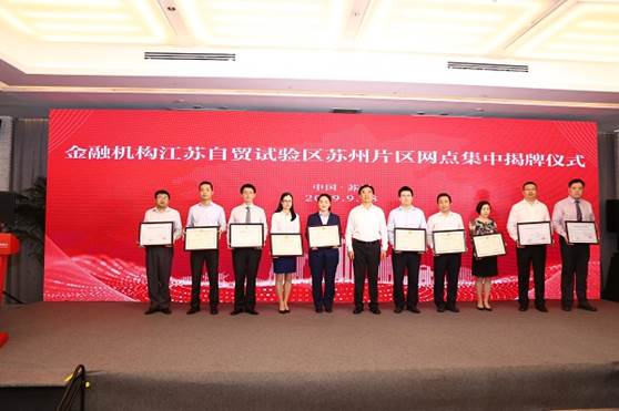 9月28日上午,金融机构江苏自贸试验区苏州片区网点集中揭牌仪式在苏州工业园区隆重举行。包括苏州银行在内的10家银行保险机构现场领取江苏自贸试验区苏州片区支行、支公司金融许可证,王兰凤董事长代表苏州银行参与了揭牌仪式。