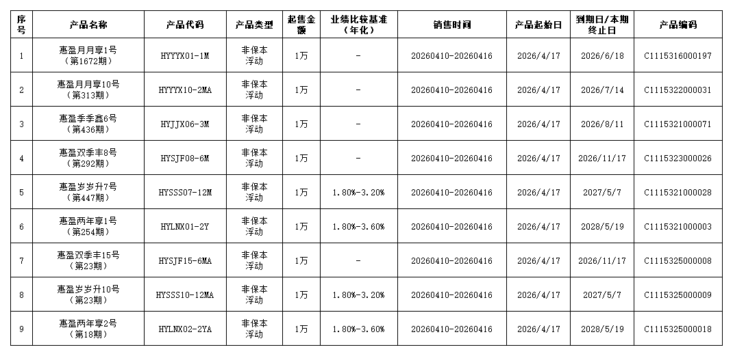 “金石榴惠盈系列”9款人民币理财产品将于2026年4月10日至2026年4月16日在我行各网点、网上银行、自助终端、手机银行发售,产品概况如下:
